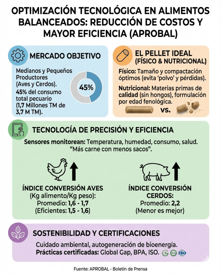 Las nuevas tecnologías de precisión en la industria de alimentos balanceados han permitido reducir costos en la nutrición de aves y cerdos, lo cual se traduce en un mayor aprovechamiento de los recursos y mejora de la competitividad de los productos nacionales, informó la Asociación de Productores de Alimentos Balanceados (APROBAL).